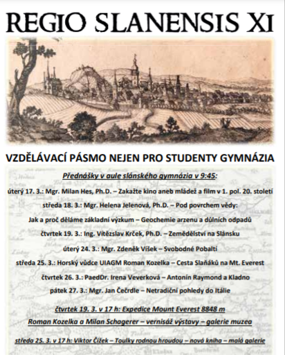 V rámci pásma Regio Slanensis XI v aule gymnázia proběhne celkem sedm přednášek (17. až 27. 3.), které jsou zdarma přístupné i široké veřejnosti a začínají vždy v 9:45.
